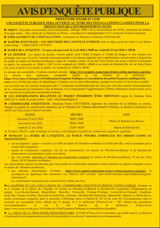 AVIS ENQUETE PUBLIQUE IPCE SAS MOUTIERS RECLAINVILLE